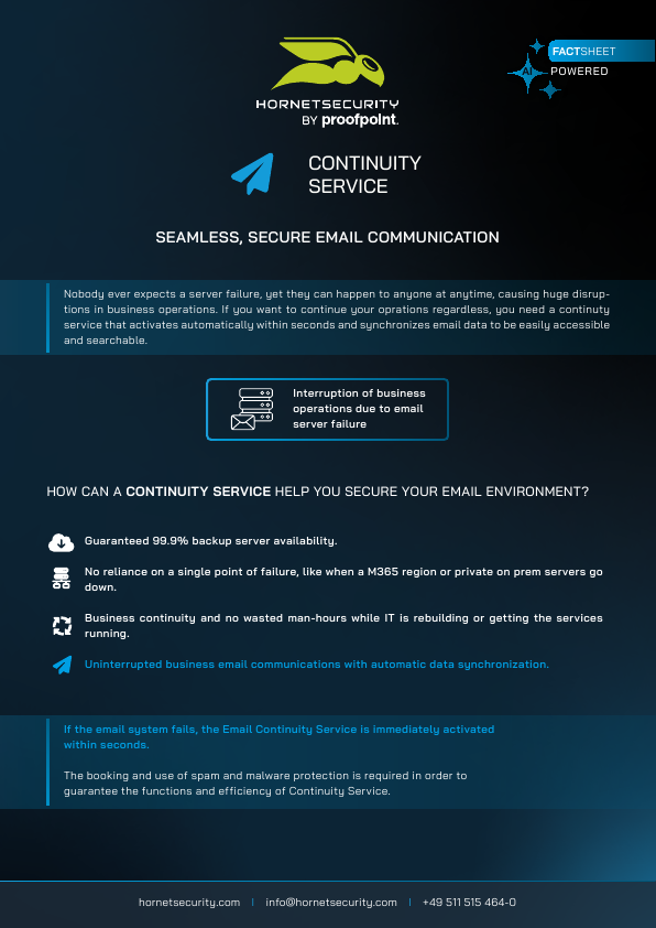 Email Continuity Service accepts and stores inbound mail while the primary server or cloud mail service is unavailable, then relays messages when delivery resumes. It reduces the operational impact of outages across hybrid estates and removes the need for ad-hoc local queueing.