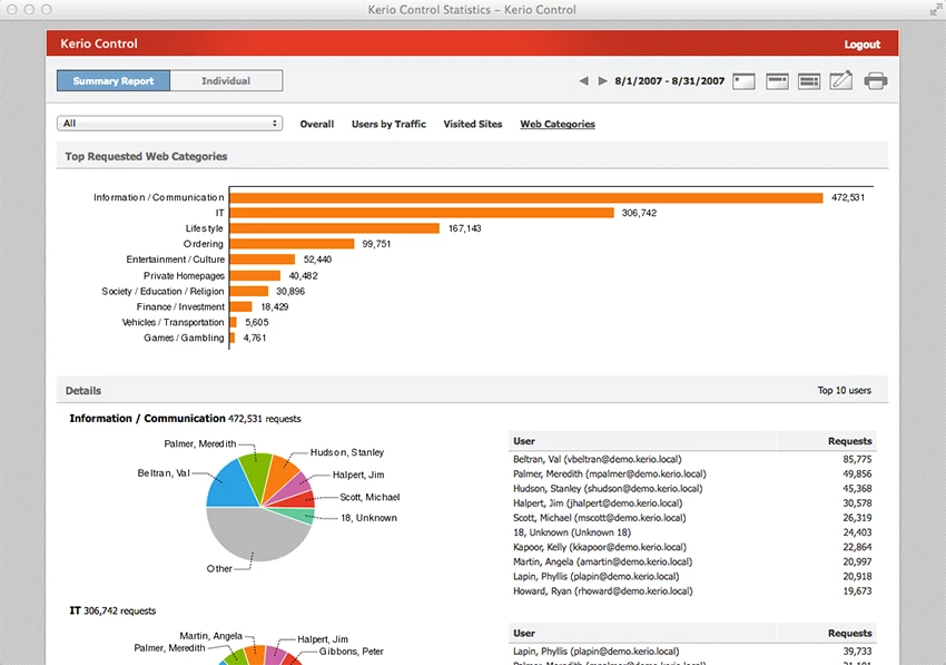 Web and application filtering for education, charities and small offices to block risky categories and generate activity reports. Managed Service Providers commonly deploy Kerio appliances to provide security controls across multiple customer sites.